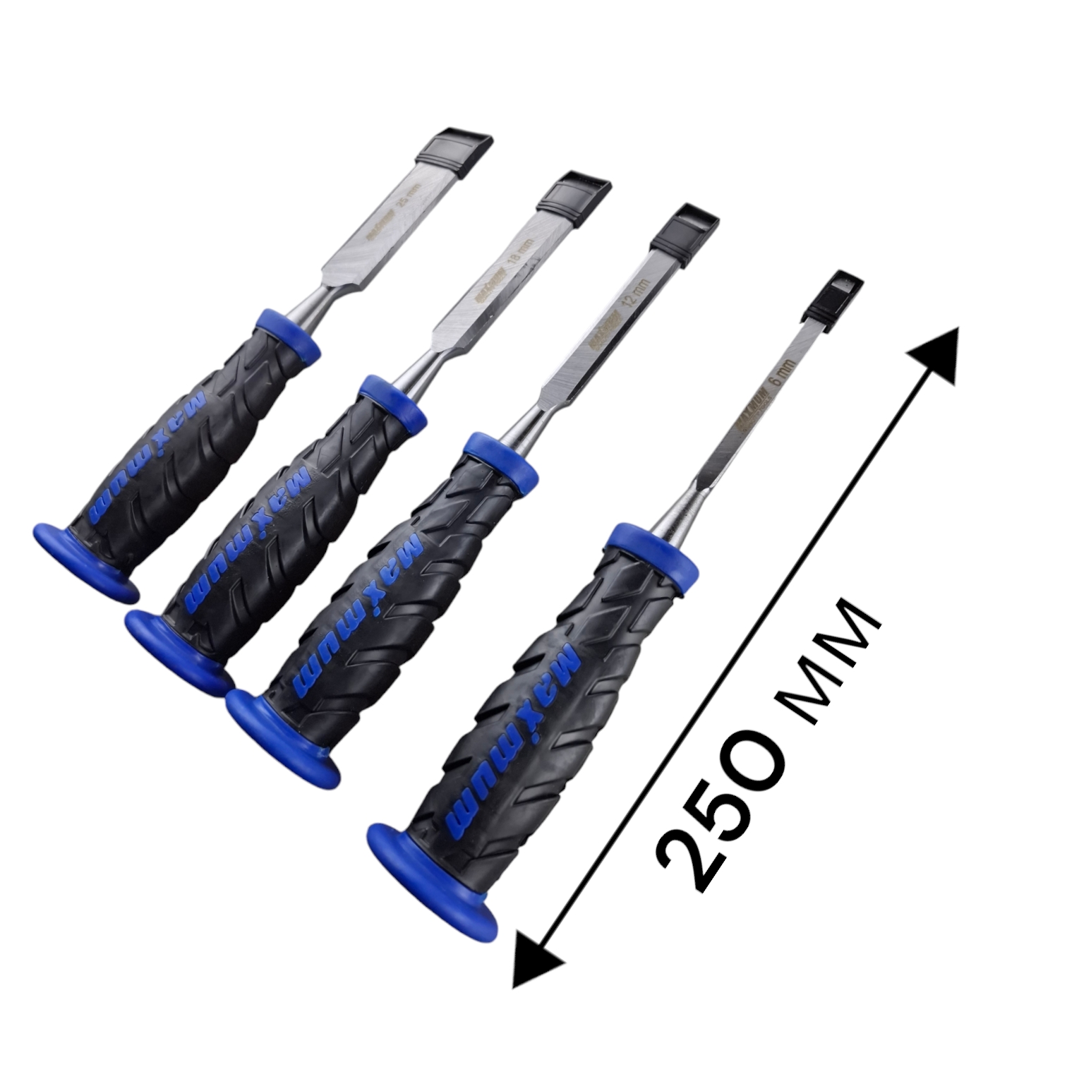 В комплект входят четыре стамески шириной 6, 12, 18 и 25 мм.