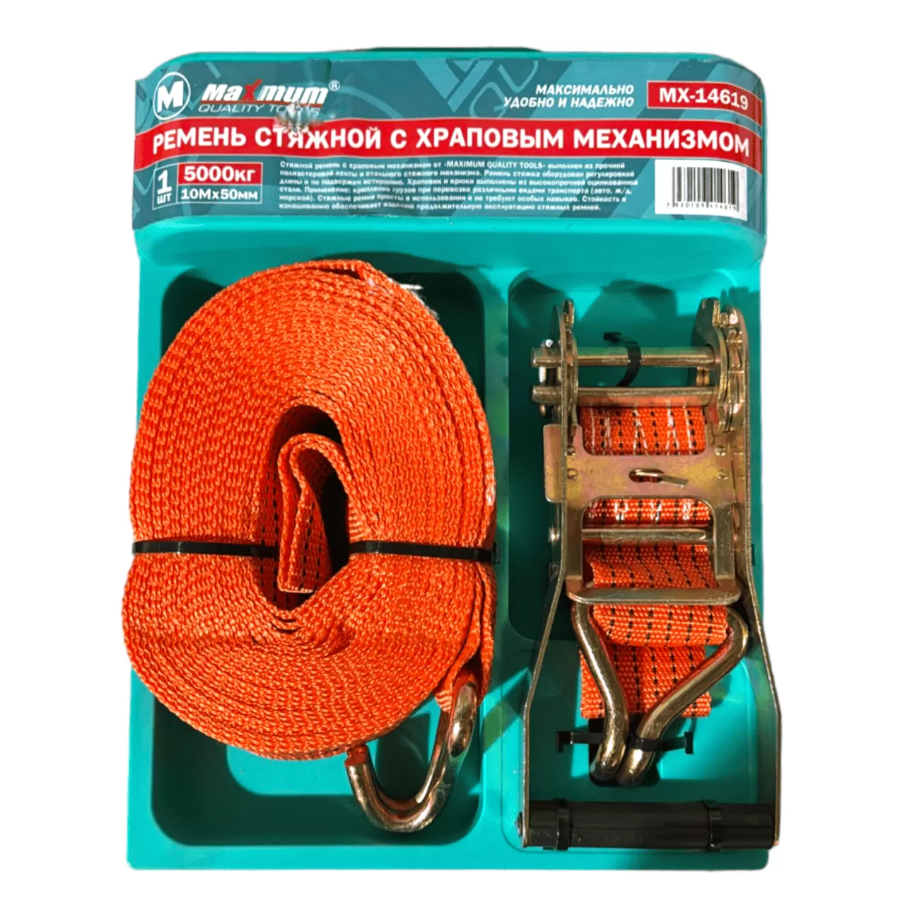 Стяжной ремень на 5 тонн от "Maximum Quality Tools" имеет удобный храповый механизм, который используется для надежной фиксации грузов на транспортных средствах. Ремень стяжку длиной 10 метров просто регулировать.